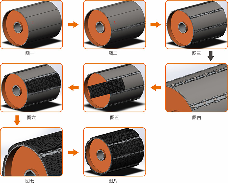 如配套方案為單邊壓條,在頭輪包膠插片插入已安裝在均分線位置的第一根單邊壓條壓腳后,用未緊固的另一根單邊壓條壓住插片金屬邊的另一側,用適當夾具(如大力夾鉗)將未緊固的單邊壓條與驅(qū)動滾筒夾緊,調(diào)整未緊固的單邊壓條與已另一側已緊固的壓條平行度后,定位焊接或螺釘緊固。完成第一組包膠插片的安裝后,再從第二個均分線位置開始安裝第二組包膠插片及壓條,以此類推,直到所有單邊壓條焊接固定或螺釘緊固在驅(qū)動滾筒上。