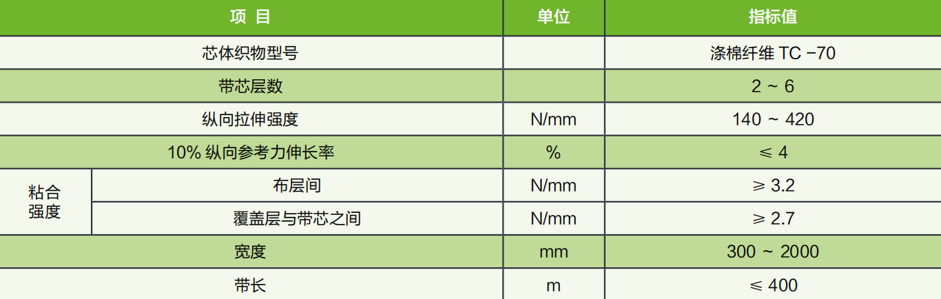 執(zhí)行GB/T7984-2001《輸送帶 具有橡膠或塑料覆蓋層的普通用途織物芯輸送帶》標(biāo)準(zhǔn)。