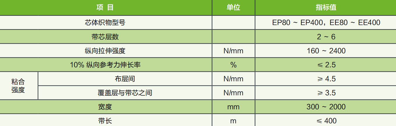1、以經(jīng)向滌綸、緯向錦綸帆布作為骨架層,帶體具有經(jīng)向延伸率低、緯向成槽性好;